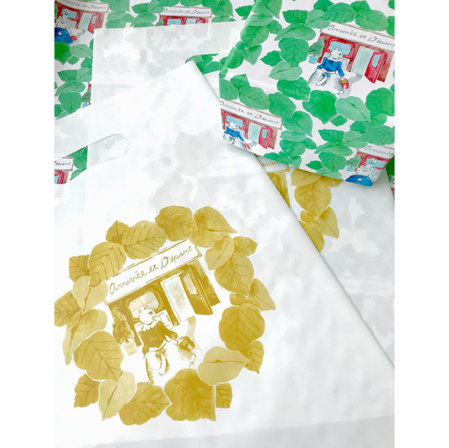 Illustration for wrappingpepar ,general store --Arrivée et Départ. 雑貨店「Arrivée et Départ 」のギフト用包装紙のイラストデザインをしました。 雑貨店を訪れる様々な可愛いお客さんたちをイメージしたデザインです。